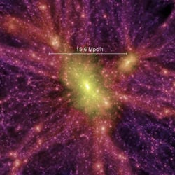 The "Millennium Simulation" employed more than 10 billion particles of matter to trace the evolution of the matter distribution in a cubic region of the Universe over 2 billion light-years on a side. It kept the principal supercomputer at the Max Planck Society's Supercomputing Centre in Garching, Germany occupied for more than a month. By applying sophisticated modelling techniques to the 25 Terabytes (25 million Megabytes) of stored output, Virgo scientists are able to recreate evolutionary histories for the approximately 20 million galaxies which populate this enormous volume and for the supermassive black holes occasionally seen as quasars at their hearts.