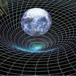 Time and space, according to Einstein's theories of relativity, are woven together, forming a four-dimensional fabric called "space-time." The tremendous mass of Earth dimples this fabric, much like a heavy person sitting in the middle of a trampoline. Gravity, says Einstein, is simply the motion of objects following the curvaceous lines of the dimple.