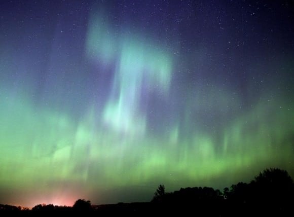 A bright, active aurora. I used my zoom lens at 16mm at f/2.8 and about a 15-second exposure at ISO 800. Credit: Bob King[/caption]
