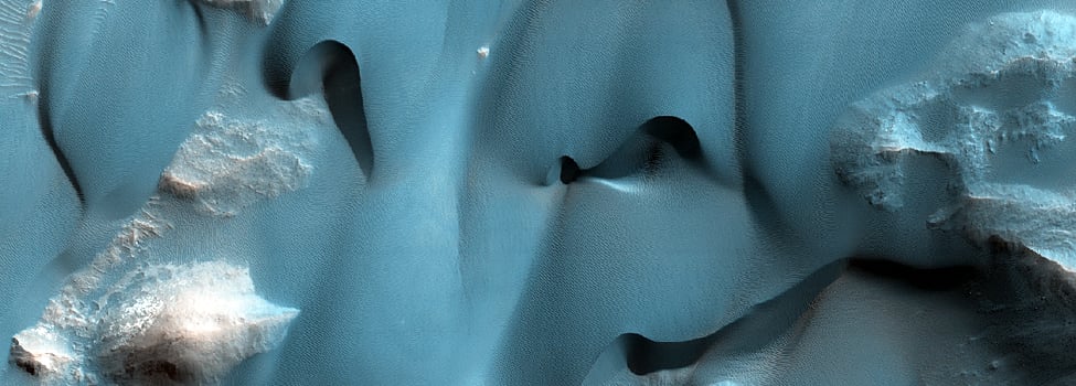 . In this image, the field of dunes is about 30 km long. This image was taken during the southern winter, when the carbon dioxide is frozen. You can see the frozen CO2 as white on the shaded side of the ridges. Scientists think that the gullies are formed when the CO2 melts in the summer.