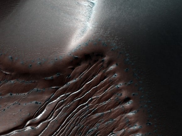 These gullies are on the dunes of Russell Crater on Mars. This image was taken during winter, and the frozen carbon dioxide on the shaded slopes. Credit: NASA/JPL/University of Arizona[/caption]