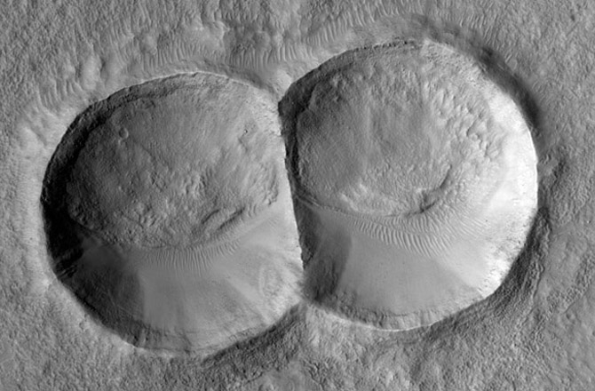 The surface of Mars is peppered with craters, and HiRise has imaged many of them. This double crater was caused by a meteorite that split in two before hitting the surface.