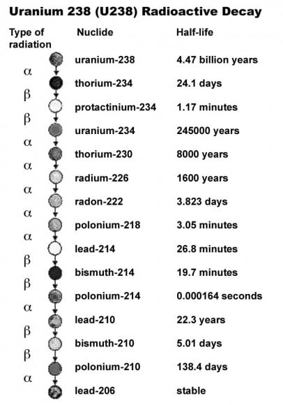 Geologists discovered that radioactive materials decay into other elements at a very predictable rate. Some materials decay quickly, while others can take millions or even billions of years to fully decay. Ernest Rutherford and Frederick Soddy, working at McGill University, determined that half of any isotope of a radioactive element decays into another isotope at a set rate. For example, if you have a set amount of Thorium-232, half of it will decay over a billion years, and then half of that amount will decay in another billion years. This is the source of the term "half life".