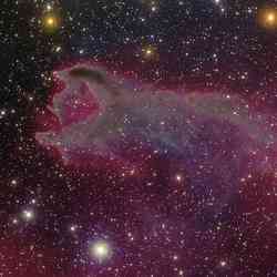 The head of the nebula is opaque, but glows because it is illuminated by light from nearby hot stars. Their energy is gradually destroying the dusty head of the globule, sweeping away the tiny particles which scatter the starlight. This particular globule shows a faint red glow from electrically charged hydrogen, and it seems about to devour an edge-on spiral galaxy (ESO 257-19) in the upper left. In reality, this galaxy is more than a hundred million light-years further away, far beyond CG4.