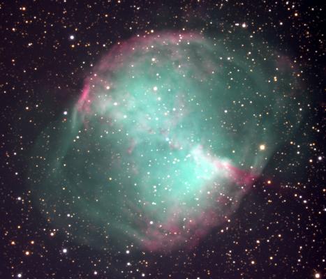 What You Are Looking At: As chance would have it, we happen to be looking at this planetary nebula from the viewpoint of its equatorial plane. Hanging out around 1200 light years from our solar system, this dying star is ejecting a shell of hot gas into space for about the last 48,000 years. The star responsible is an extremely hot blueish subdwarf dwarf – which emits primarily highly energetic radiation of the non-visible part of the electro-magnetic spectrum, which is absorbed by exciting the nebula’s gas, and re-emitted by the nebula. What’s that spell? Try the forbidden zone of doubly ionized oxygen… one spectral line only, in the green light at 5007 Angstroms! That’s why Messier 27 glows like a green apple core.