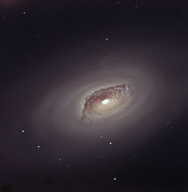 But, M64 isn’t without it share of turmoil. Its dual rotation may have started as a collision when two galaxies merged some billion years ago – or so theory would suggest. But did it? “This galaxy is known to contain two nested, counter rotating, gas disks of a few 108 solar mass each, with the inner disk extending to approximately 1 kpc and the outer disk extending beyond. The stellar kinematics along the major axis, extending across the transition region between the two gas disks, show no hint of velocity reversal or increased velocity dispersion. The stars always rotate in the same sense as the inner gas disk, and thus it is the outer disk which ‘counterrotates’. The projected circular velocities inferred from the stellar kinematics and from the H I disks agree to within approximately 10 km/s, supporting other evidence that the stellar and gaseous disks are coplanar to approximately 7 deg.” say Robert Braun and Rene Walterbos, “This upper limit is comparable to the mass of detected counter rotating gas. This low mass of counter rotating material, combined with the low-velocity dispersion in the stellar disk, implies that NGC 4826 cannot be the product of a retrograde merger of galaxies, unless they differed by at least an order of magnitude in mass. The velocities of the ionized gas along the major axis are in agreement with that of the stars for R less than 0.75 kpc. The subsequent transition toward apparent counter rotation of the ionized gas is spatially well resolved, extending over approximately 0.6 kpc in radius. The kinematics of this region are not symmetric with respect to the galaxy center. On the southeast side there is a significant region in which vproj (H II) much less than vcirc approximately 150 km/s, but sigma (H II) approximately 65 km/s. The kinematic asymmetries cannot be explained with any stationary dynamical model, even is gas inflow or warps were invoked. The gas in this transition region shows a diffuse spatial structure, strong (N II) and (S II) emission, as well as the high-velocity dispersion. These data present us with the conundrum of explaining a galaxy in which a stellar disk, and two counter rotating H I disks, at smaller and much larger radii, appear in equilibrium and nearly coplanar, yet in which the transition region between the gas disks is not in steady state.”