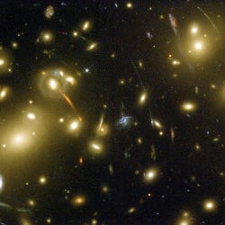 Galaxy Cluster Abell 2218 distorting the light from several more distant galaxies. Image credit: ESO.