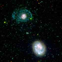 "We know that interactions between galaxies can spur the creation of stars, but it is not clear why only one galaxy ended up with arms," said Dr. Chris Martin of the California Institute of Technology in Pasadena, Calif, principal investigator for the Galaxy Evolution Explorer.