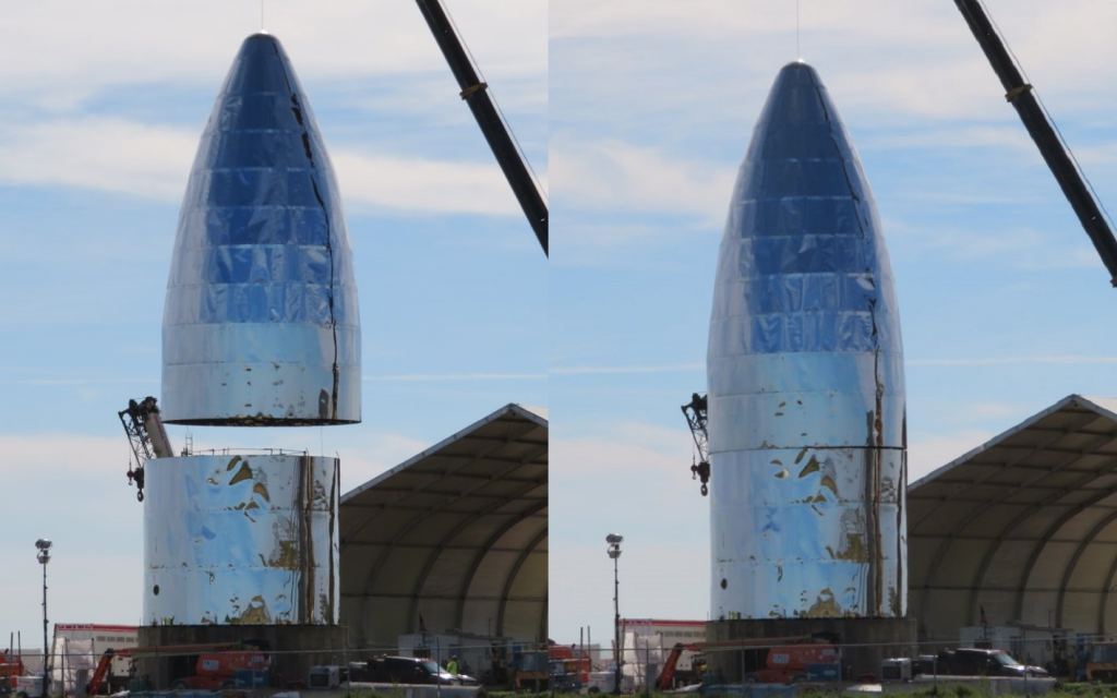 Subsequent images posted by bocachicagal on Jan. 4th that showed the nose cone being integrated with the last section of the hull and then moved next to the "water tank". Images posted on Jan. 5th by Austin Barnard showed the two sections positioned next to each other and the aft section being covered in the same silver skin.