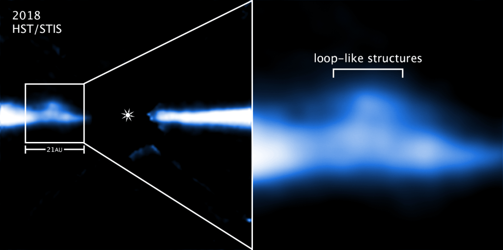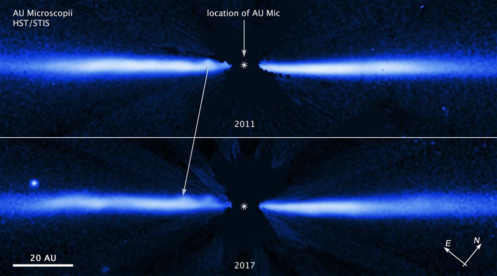The new observations from the Hubble and the VLT of the red dwarf AU Microscopii show something different happening. AU Micro is a very young star, only 12 million years old, which is less than 1% of the Sun's age. So we're looking at a young star and solar system in its formative years. And these observations show massive globs of rapidly moving material sweeping through the young solar system.