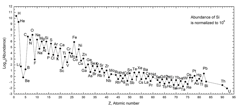In our Universe, elements other than hydrogen and helium are created by nucleosynthesis in stars. (Hydrogen, helium, and some lithium and beryllium were created in Big Bang nucleosynthesis.) But the elements aren't created in equal amounts. There's an image that helps show this.