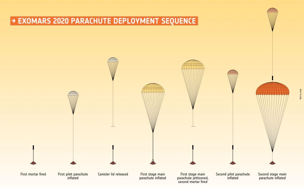 Once the rover and lander are ready, they will be placed inside a descent module that will be transported to Mars by a carrier module (which will be launched from Baikonur atop a Russian Proton rocket). Once it enters Mars' atmosphere, the descent module will rely on two parachutes (each of which has its own pilot chute for extraction) to slow itself down to the point where the braking engines can engage.