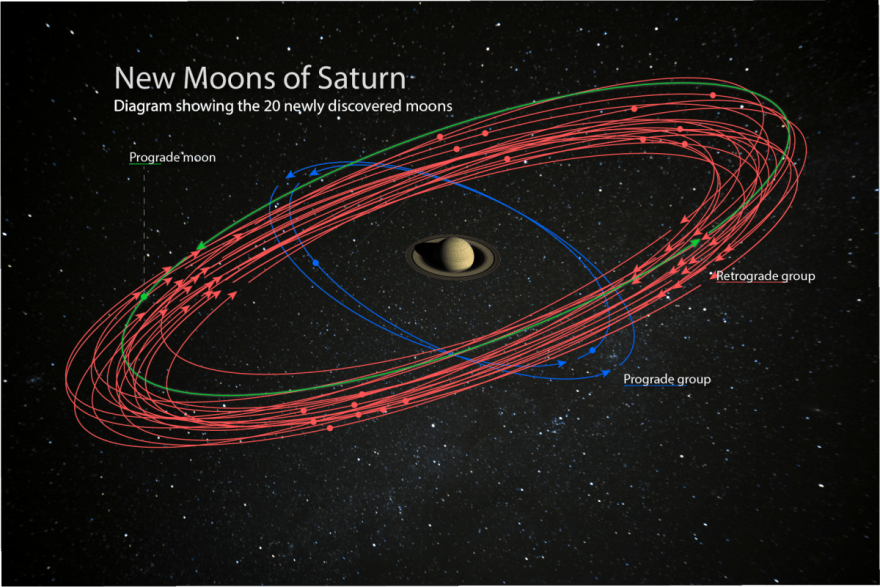 Two of the newly discovered prograde moons fit into the Inuit group, which have inclinations of about 46 °, while the retrograde moons are part of the Norse group. The two satellites closest to Saturn have prograde motions and an orbital period of about two years while the more-distant moons - which include two retrograde and one prograde moon - have orbital periods of more than three years.