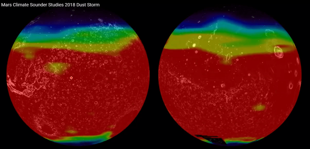 NASA's Odyssey orbiter has been at Mars for 18 years. Its THEMIS (Thermal Emission Imaging System) instrument also keeps track of Mars' surface temperature, atmospheric temperature, and the amount of dust in the air.