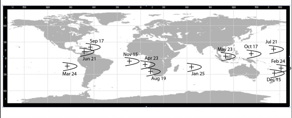 -Mars (5): (Feb 18) North America, -24% Moon – (Mar 18) the southernmost tip of South America, -30% Moon – (Aug 9) SE South America -72% Moon – (Sep 6) Central South America -85% Moon – (Oct 3) the southernmost tip of South America, -98% Moon.