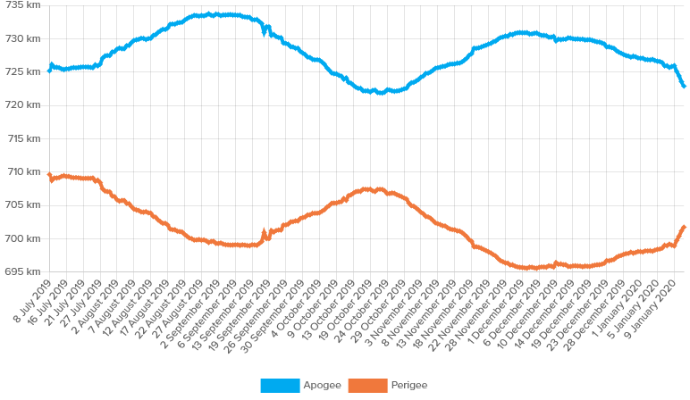 LightSail 2's apogee and perigee have been cycling up and down over the five months since its deployment. Immediately following deployment, the spacecraft raised its apogee, making it the first solar sail spacecraft to do so. At the same time, the perigee decreased. It experienced a reversal of the trend in late October, and a reversion in December.
