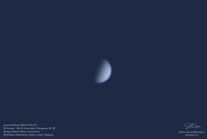 Now, greatest elongation is the point where the Earth, Venus and the Sun form an imaginary right triangle through the inner solar system… Venus 'should' appear as a tiny half illuminated disk right on this date. Over the centuries, however, observers have noticed that this event, known as ' dichotomy,' tends to fall a few days late. Possible explanations for this discrepancy include the thick atmosphere of Venus refracting sunlight along the terminator… or perhaps, it's just a simple optical illusion. In 2020, theoretical dichotomy is expected to occur three days after greatest elongation on March 27th. When does Venus appear exactly half-illuminated to you?