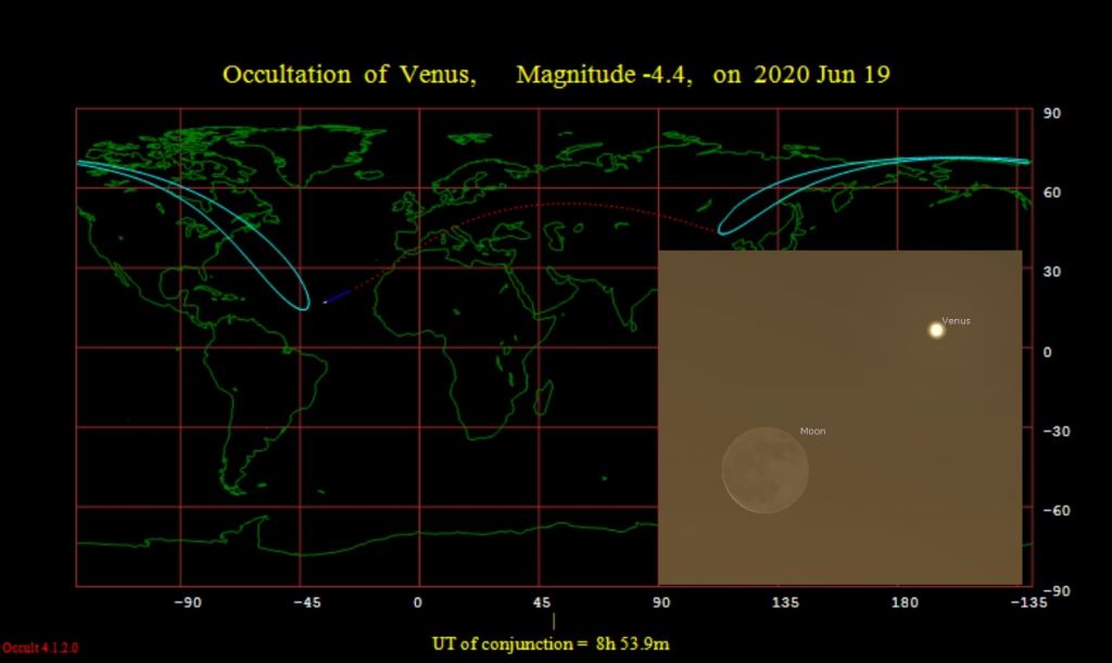 The Moon actually occults (passes in front of Venus) twice in 2020: Once on June 19thfor northeastern North America, and again after inferior conjunction on December 12thfor northeastern Asia.