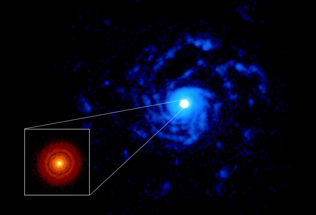 And that gas is weird. It's not just a normal cloud or disk, but a spiral. Giant spiral arms wrap around the star, cuddling the inner young star closely.
