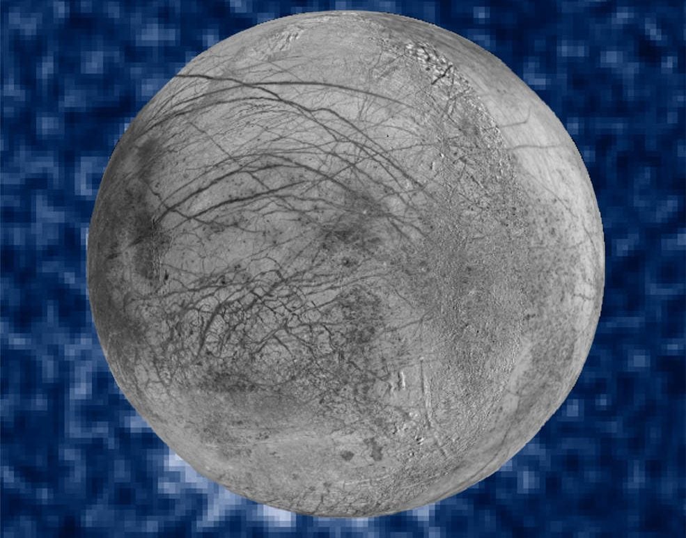 The new Hubble image also shows a single one of the Galilean moons: Europa. Researchers believe that Europa harbours an ocean under its icy surface, and in 2013 the Hubble spotted water vapour in plume(s) coming from the moon's south pole.