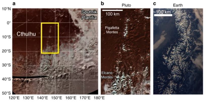 "It is remarkable that two phenomena and two materials that are so dissimilar could produce the same landscape when seen at similar resolution."From "Equatorial mountains on Pluto are covered by methane frosts resulting from a unique atmospheric process"