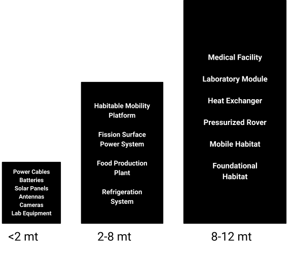 For example, a power system in the <2 metric ton range would include something like solar panels, batteries, or fuel cells. In the 2-8 metric ton range, it would involve a fission surface power system or a full-scale solar array. In terms of infrastructure, a less than 2 metric ton payload would be thermal protection or radiation shielding material, while an 8-12 metric ton payload would be an additive manufacturing (3-printing) plant.