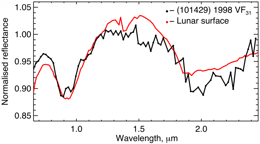 That said, we should be cautious about jumping to conclusions. The spectrum comparison is not precise enough to confirm a lunar origin. Other bodies are also known to have pyroxene on their surface. All we know for sure is that 101429 has an origin different from the other Martian trojans.