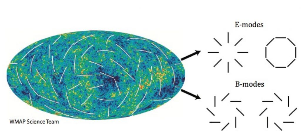 If there were nothing but empty, flat space between us and the cosmic microwave background, then all the light from the CMB would be E-mode polarized. But deep space isn't empty. It's filled not only with diffuse gas and dust, but also dark matter and dark energy. As the light from the big bang travels through this, its polarization changes slightly, twisting through an angle, ?. This shifts the orientation of CMB light toward B-mode polarization.