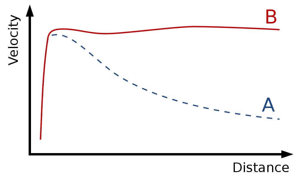 In the dark matter model, these curves are explained by the fact that dark matter comprises most of the matter in a galaxy and surrounds the galaxy in a halo, so most matter isn't concentrated at the center. MoND explains the curves by assuming the gravitational pull from other galaxies tweaks the inertial mass of stars farther from the center, which is why they move faster than expected.