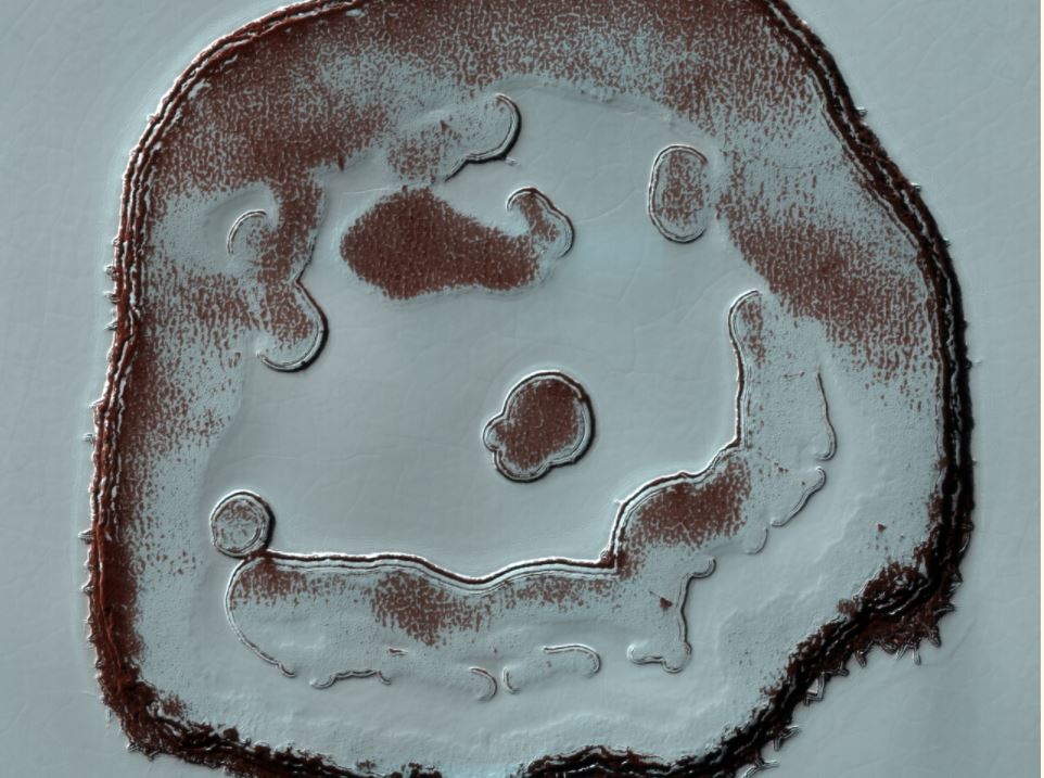 Who has an even bigger grin than ten years ago? This goofy-looking crater on Mars.