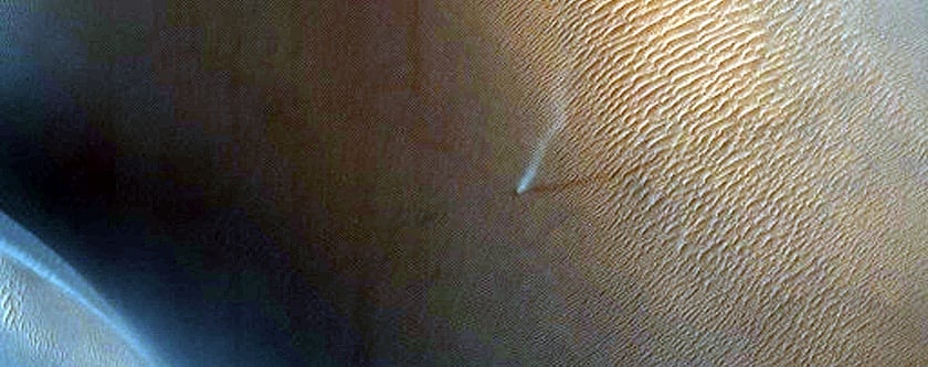 The HiRISE camera on the Mars Reconnaissance Orbiter has captured several dust devils in action, including this lonely whirling dust cloud traversing across a small crater on the Red Planet.