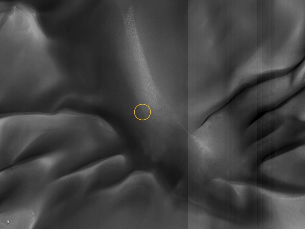 The orbiter's main objective of this observation, the HiRISE science team said, was to track changes over time of the dunes north of Antoniadi Crater. While HiRISE often catches nature in action (such as an avalanche on Mars), in this case, it's a well-defined dust devil traversing the dunes, leaving exposed, darker subsurface material in its wake.
