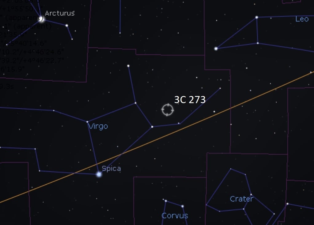 The coordinates for 3C 273 are: Right Ascension (R.A.) 12H 29' 07," Declination 02 degrees 03' 09".