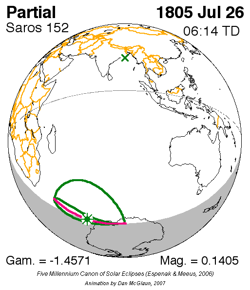 This weekend's eclipse is member 13 of 70 eclipses in relatively new solar eclipse saros series 152. This particular series 'just' started back on July 26th, 1805, and produced its very first total solar eclipse on November 2nd1967. Said 2003 eclipse was actually member 12 of the same solar saros series, 18 years ago. Saros series 152 concludes its run of total solar eclipses on September 14th, 2490, and ends completely with a final shallow partial solar eclipse on August 20th, 3049 AD.