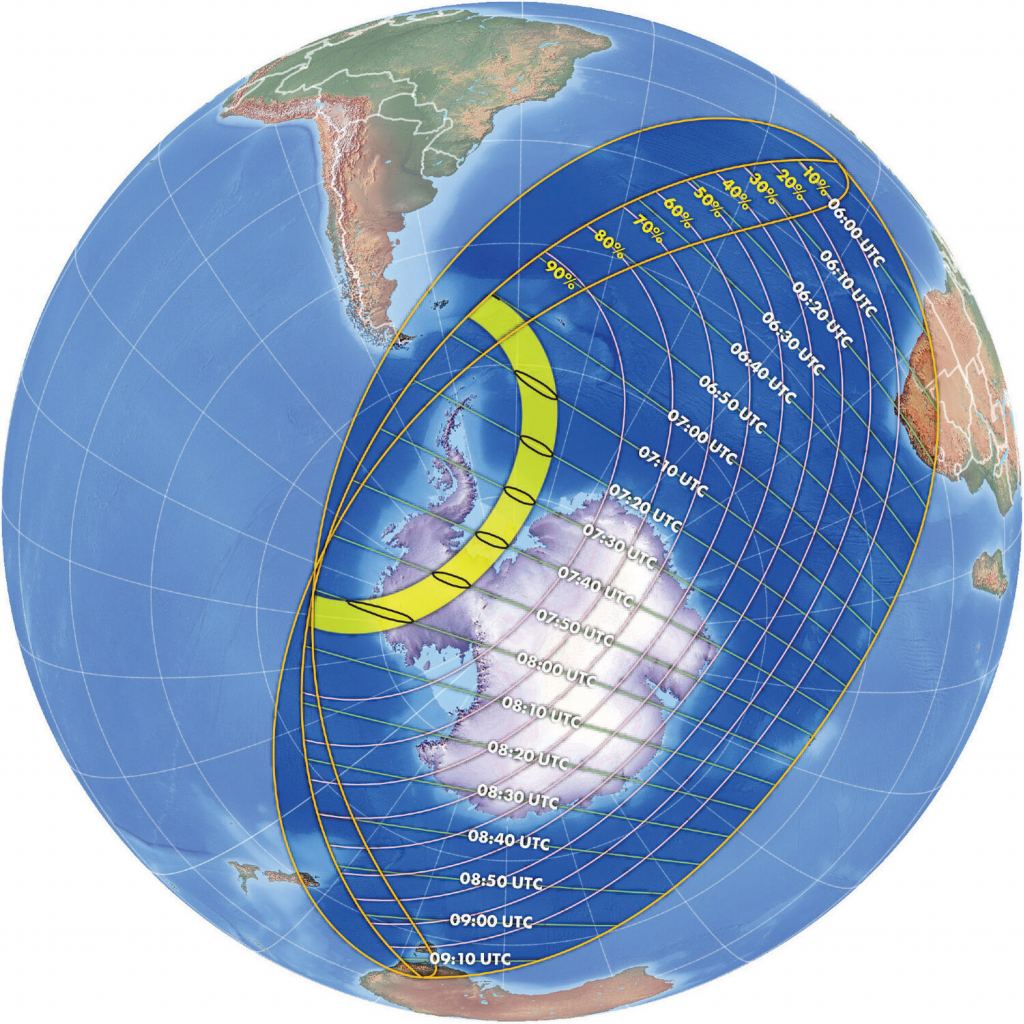 Penumbral/partial phases for the eclipse run from 5:29 to 9:37 Universal Time (UT), at just over four hours overall. Totality starts at 7:00 UT as the 418 kilometer-wide umbra of the Moon touches down over the South Atlantic, just east of the Falkland Islands. Maximum eclipse occurs at 7:33 UT over the Weddell Sea, with a duration of 1 minute and 54 seconds. The shadow then sweeps out over Antarctica, and departs the Earth over the South Pacific at 9:37 UT.