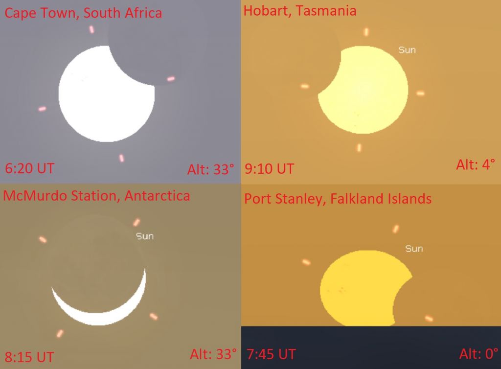 But do not despair: though the path of totality is indeed remote, the entire continent of Antarctica sees partial phases of the eclipse. Overall, the partial eclipse also touches the edges of three continents, including the Falkland Islands (South America), South Africa, and Tasmania (Australia). These are all very low to the horizon events transpiring at sunrise or sunset, making for a photogenic eclipse that you can capture along with foreground objects on the horizon.
