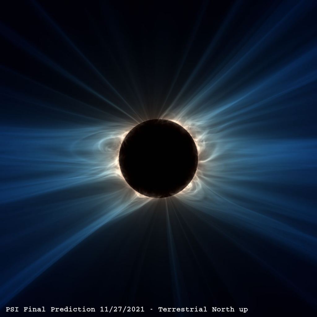 What will the Sun look like, come eclipse day? Well, as of writing this, there are a few small sunspot groups currently turned Earthward as Solar Cycle #25 gets underway. That'll make for a photogenic Sun for astro-imagers in the partial zone, versus a featureless blank disk. For the few folks lucky enough to stand in the Moon's shadow during totality, Predictive Science Inc. predicts that the solar corona will look something like this, come eclipse day: