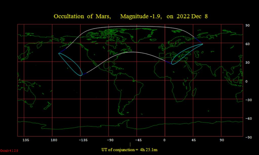 -December 8th: the Full Moon occults Mars (at opposition) for North America and Europe.