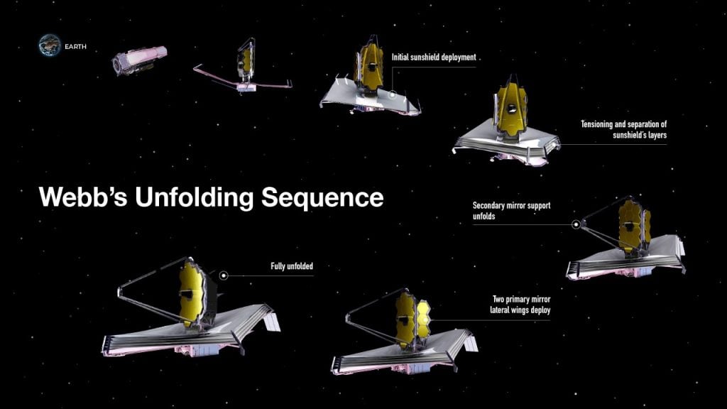 The entire set of sequences will span over two days. Starting on December 31 comes the Sunshield Port Side Mid-Boom Extension, which pulls out the sunshield out on one side. This has a current scheduled start time of 9:20 AM EST (1420 UTC). If all goes well, the Starboard side will be deployed on January 1.