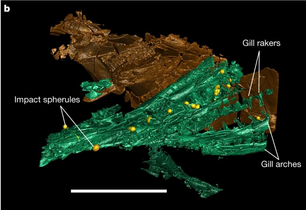 Impact spherules -- small bits of molten rock ejected from the crater went high into the atmosphere or even to space where they crystallized into a glass-like material -- were found lodged in the fishes' gills.
