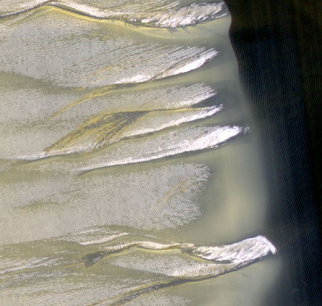 "Bright patches of frost (white in enhanced color) are clearly visible and are made up of water and carbon dioxide ices," writes HiRISE team member Susan J. Conway. "Dark streaks of sand have flowed down the dune's slope that sometimes covers the frost. These flows are caused by the rapid transformation of the frost from ice to gas as the sun heats the dune in the spring."