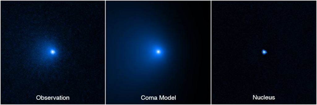 As with any comet, the challenge comes in trying to measure the solid nucleus while it is enveloped in a huge dusty coma. While the comet is currently too far away for its nucleus to be visually resolved by Hubble, the data did show a bright spike of light at the nucleus' location. Hui and his team next made a computer model of the surrounding coma and adjusted it to fit the Hubble images. Then, the glow of the coma was subtracted to leave behind the starlike nucleus.