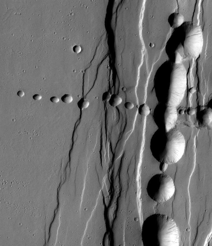 Pit craters are found on solid bodies throughout our Solar System, including Earth, Venus, the Moon, and Mars. These craters – which are not formed by impacts -- can be indications of underground lava tubes, which are created when the top of a stream of molten rock solidifies and the lava inside drains away, leaving a hollow tube of rock. If a portion of the roof of the tube is unsupported, parts of it may fall in, making a hole or a pit along the lava tube's path.