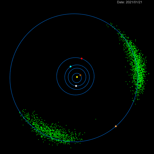 Trojan asteroids are small bodies that have happened to get trapped in Jupiter's Lagrange points. These are regions in Jupiter's orbit about sixty degrees ahead and behind Jupiter itself. Through the gravitational dance of Jupiter and Sun, the Lagrange points are rather deep gravitational wells, so anything that finds itself there tends to stay there. So as Jupiter parades around the Sun, it has a cluster of Trojans marching along ahead and behind it.