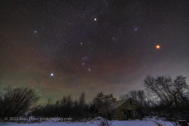 As Dyer said, this is a gathering of many red stars, planets and the rare red Moon. "The red Moon at right beside the stars of the northern winter sky and Milky Way, plus with bright red Mars at top. Above and left of the Moon is the blue Pleiades star cluster, while below it and to the left is the larger Hyades cluster with reddish Aldebaran in Taurus. The stars of Orion are left of centre, including reddish Betelgeuse, while at far left are the two Dog Stars: Procyon, at top, in Canis Minor, and Sirius, at bottom, in Canis Major."