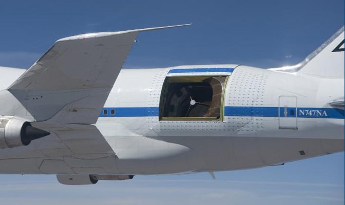 SOFIA, the Stratospheric Observatory for Infrared Astronomy, is a Boeing 747SP aircraft modified to carry a 2.7-meter (106-inch) reflecting telescope. Flying into the stratosphere at 13 km (38,000-45,000 feet) puts SOFIA above 99 percent of Earth's infrared-blocking atmosphere, allowing astronomers to study the universe in ways that are not possible with ground-based telescopes.