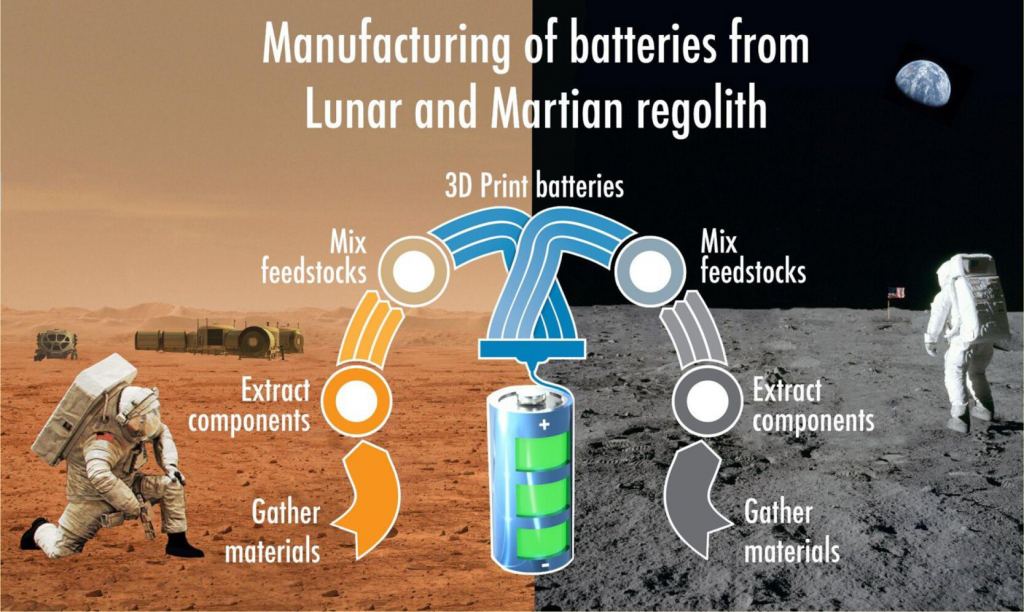 When the Artemis astronauts and future explorers go to the Moon and Mars, they'll need powe r. Lots of it. Of course, they'll use solar panels to generate the juice they need for habitats, experiments, rovers, and so on. But, they'll need batteries for power storage. Those things weigh a lot and cost a fortune to send up from Earth. So, why not simply 3D print their own when they get there?
