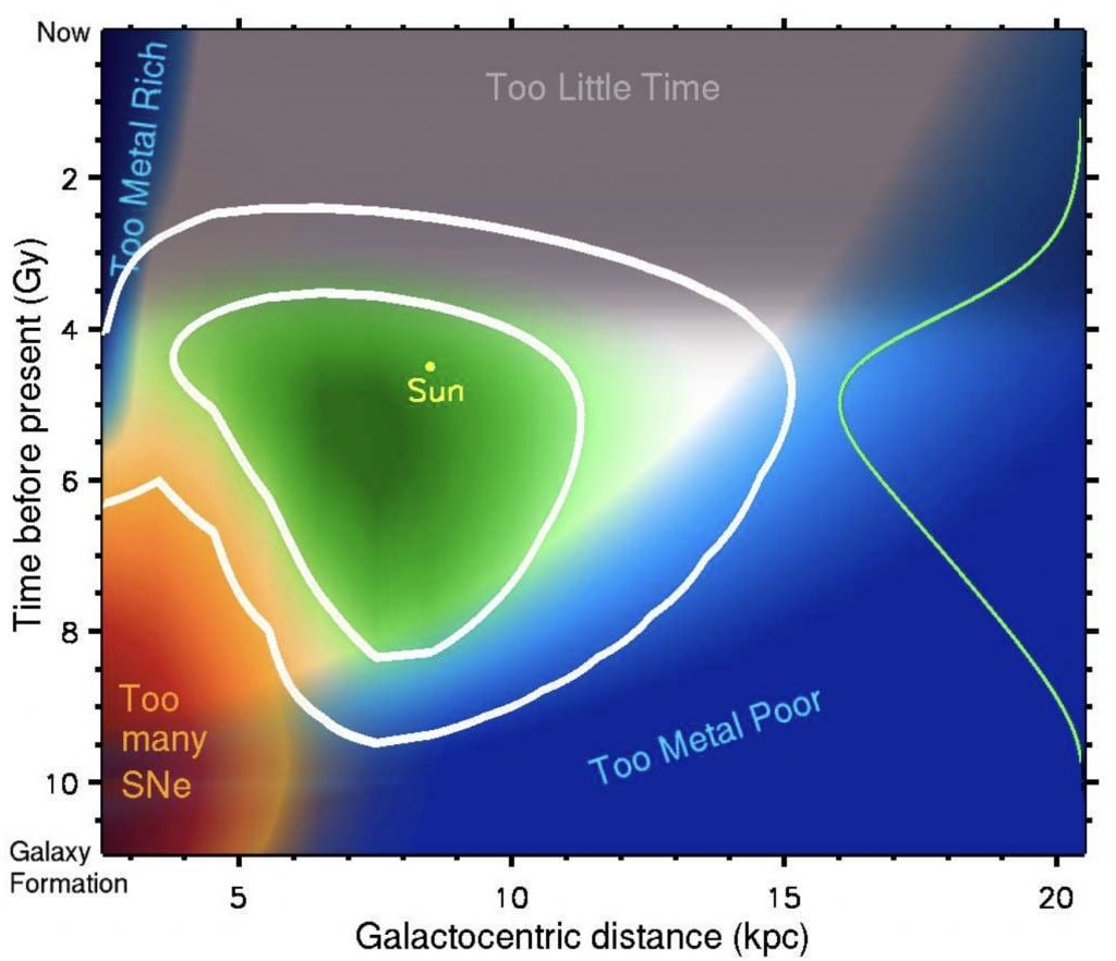 Reference: Lineweaver, Charles H., Yeshe Fenner, and Brad K. Gibson. " The galactic habitable zone and the age distribution of complex life in the Milky Way." Science 303.5654 (2004): 59-62.