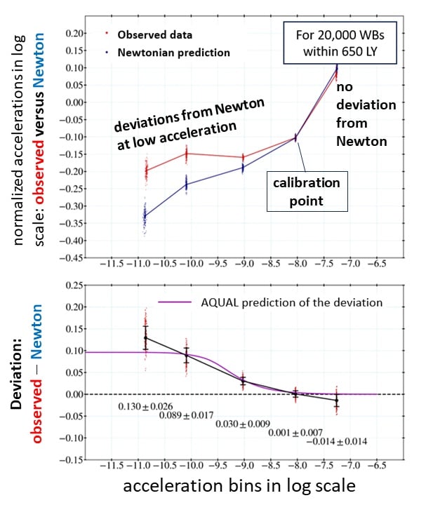 Taking data from the Gaia Space Telescope, the author analyzed the orbital motion of 26,500 wide-binary systems and compared the gravitational accelerations of the stars with their orbital separations. At larger accelerations, the orbits agree with both AQUAL and Newtonian gravity, but at smaller accelerations, the binary orbits deviate from Newton exactly as AQUAL predicts. In other words, for thousands of binary systems, AQUAL is a better model of their motion than Newton. This would seem to contradict dark matter models.