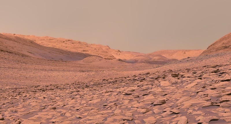 About three billion years ago, rushing water on Mars carried mud and boulders down a steep slope and deposited them into a vast fan-shaped debris pile. NASA's Curiosity Rover has been trying to reach a ridge overlooking the region, and now finally, the rover has reached this vantage point after three years of climbing. NASA released a 360-degree view image of the region, showing the jumble of rocks strewn about by the rushing water. Now, Curiosity is reaching out to touch and study them.